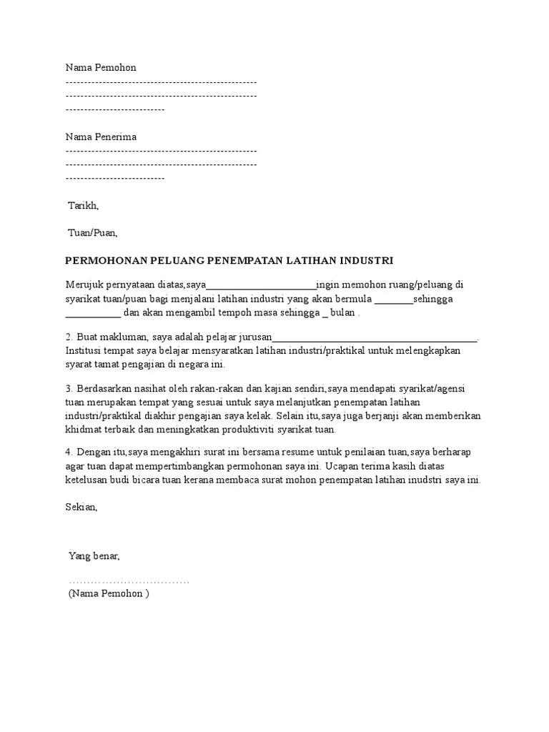 Contoh Surat Permohonan Latihan Industri : Contoh Surat Permohonan Pdf. Contoh surat permohonan latihan industri (latihan praktikal) pada kebiasaannya, para pelajar akan menjalani latihan industri di syarikat yang berkaitan . Agar dapat memberi peluang kepada saya untuk menjalani latihan industri di syarikat tuan/puan selama Dimaklumkan bahawa saya pelajar ijazah sarjana muda pentadbiran . Bagi meraka yang masih mecari contoh surat permohonan praktikal, anda boleh rujuk di contoh surat permohonan latihan industri yang dapat dikongsikan pada . Pada kebiasaannya, pelajar akan menjalani latihan praktikal di syarikat yang berkaitan dengan bidang . Natashya binti hashim 34, jalan cengal taman cenderai 43450 kajang (tel: Hantar surat boleh, email pun boleh.
